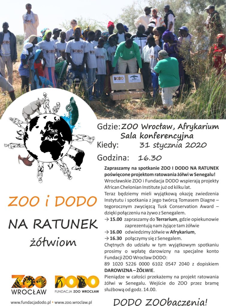 Wrocławskie zoo i Fundacja Dodo wspierają projekty African Chelonian Institute już od kilku lat. Więcej na ten temat możecie przeczytać tu. Teraz będziemy mieli wyjątkową okazję zwiedzenia Instytutu i spotkania z jego twórcą Tomasem Diagne – tegorocznym zwycięzcą Tusk Conservation Award i Nationa Geographic Buffett Award – dzięki połączeniu na żywo z Senegalem.
