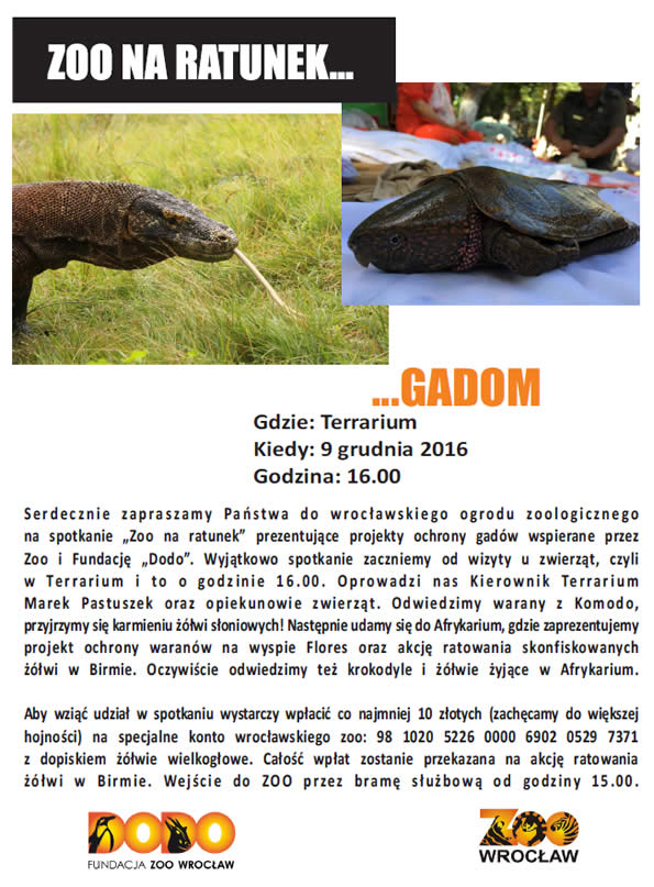 W najbliższy piątek (09.12.2016), w Terrarium wrocławskiego ZOO, o godzinie 16.00 odbędzie się spotkanie poświęcone hodowli i ochronie gadów.