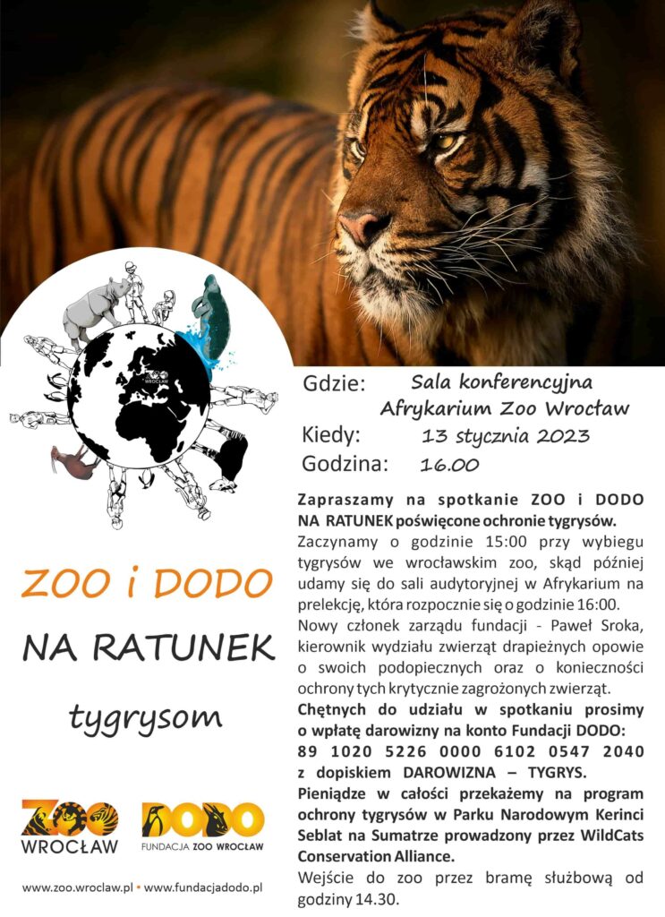 Chętnych do udziału w tym wyjątkowym spotkaniu prosimy o wpłatę darowizny na specjalne konto Fundacji Zoo Wrocław Dodo: 89 1020 5226 0000 6102 0547 2040 z dopiskiem DAROWIZNA – TYGRYSY. Pieniądze w całości przekażemy na program ochrony tygrysów w Parku Narodowym Kerinci Seblat na Sumatrze prowadzony przez WildCats Conservation Alliance.