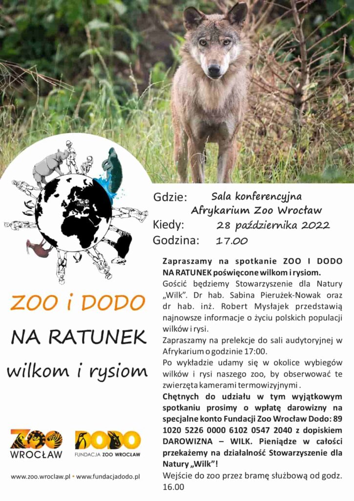 Zapraszamy na spotkanie Zoo i Dodo na ratunek poświęcone wilkom i rysiom. Gościć będziemy Stowarzyszenie dla Natury „Wilk”. Dr hab. Sabina Pierużek-Nowak oraz dr hab. inż. Robert Mysłajek przedstawią najnowsze informacje o życiu polskich populacji wilków i rysi. Zapraszamy na prelekcje do sali audytoryjnej w Afrykarium o godzinie 17:00. Po wykładzie udamy się w okolice wybiegów wilków i rysi w naszym zoo, by obserwować te zwierzęta kamerami termowizyjnymi .