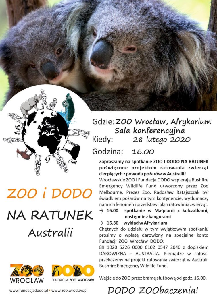 Chętnych do udziału w tym wyjątkowym spotkaniu prosimy o wpłatę darowizny na specjalne konto Fundacji Zoo Wrocław Dodo: 89 1020 5226 0000 6102 0547 2040 z dopiskiem DAROWIZNA – AUSTRALIA. Pieniądze w całości przekażemy na projekt ratowania zwierząt w Australii Bushfire Emergency Wildlife Fund.